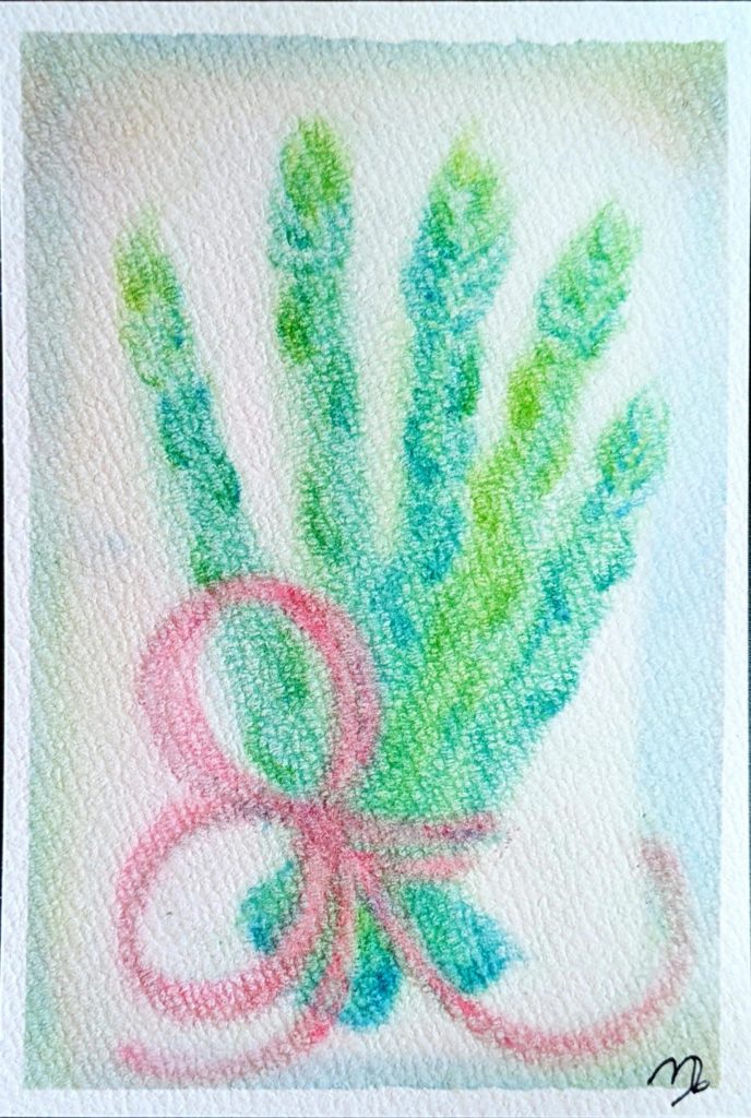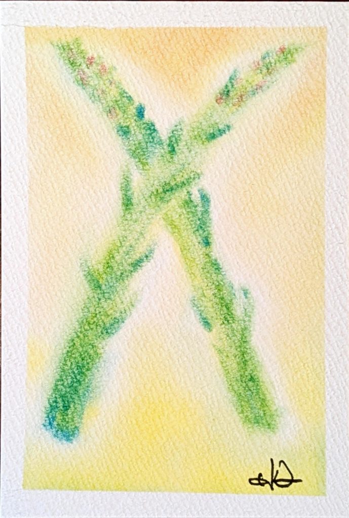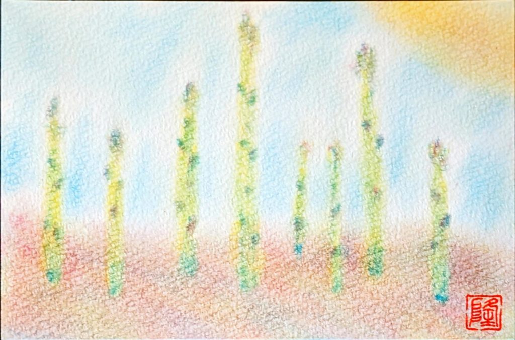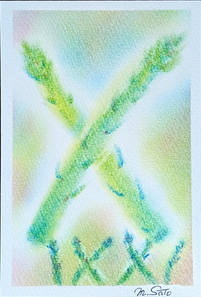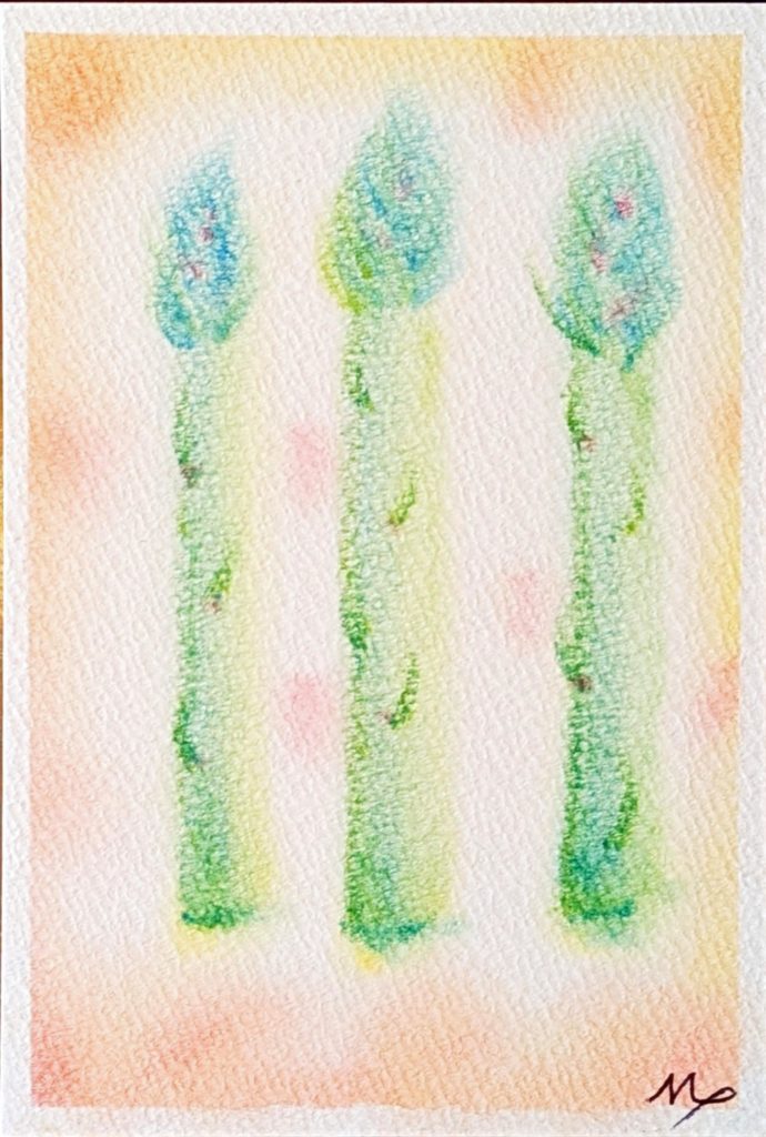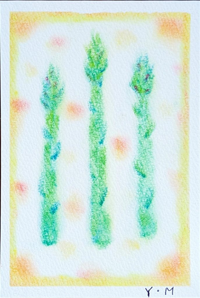 2枚目以降はアレンジOK。ペンで描かれた風景に色を載せていらっしゃる方、土から伸びたアスパラガスや束になっているアスパラガスを描かれた方、猫の持っている剣がアスパラガス!なんてユーモアあるアイデアまで飛び出し、またまた楽しい鑑賞会になりました。