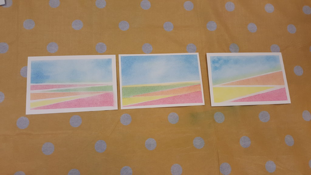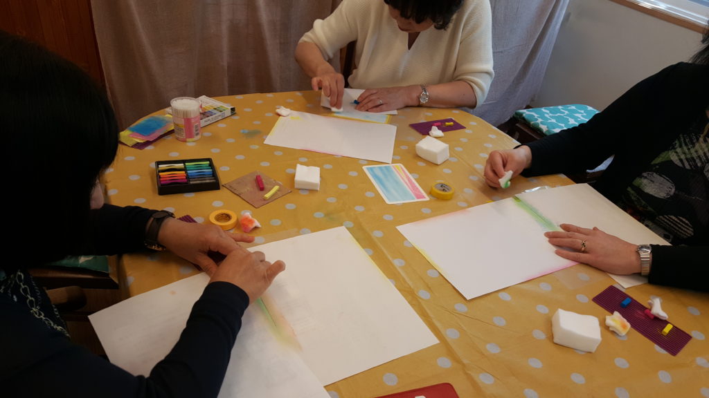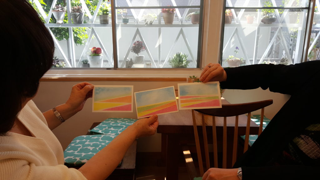 楽しく談笑しながらのスタート。先月のお題の「花畑」を描いていただきました。あくまで使用する色は3色のみですが、その混ぜ具合によって風合いが変わるので「面白いわね~」と喜んでいただけました。出来上がりも三者三様で「比較するものではない」旨をお伝えすると、「個性が出ていていいかも。自宅に持って帰れば比較するものもないしね。飾ってみるわ」とご満足いただけたご様子でした。