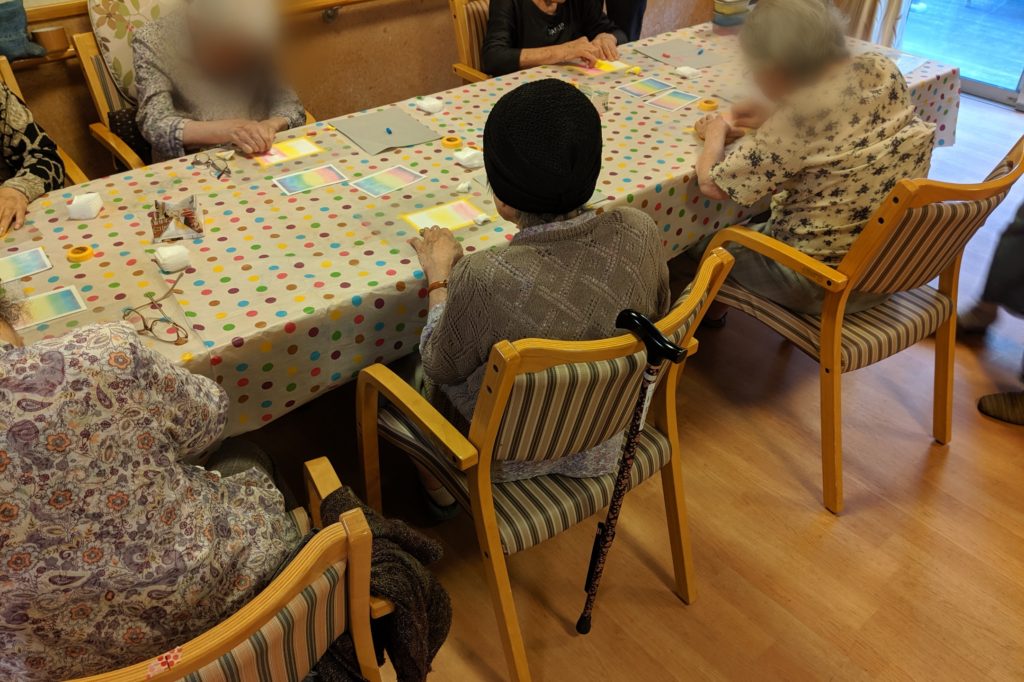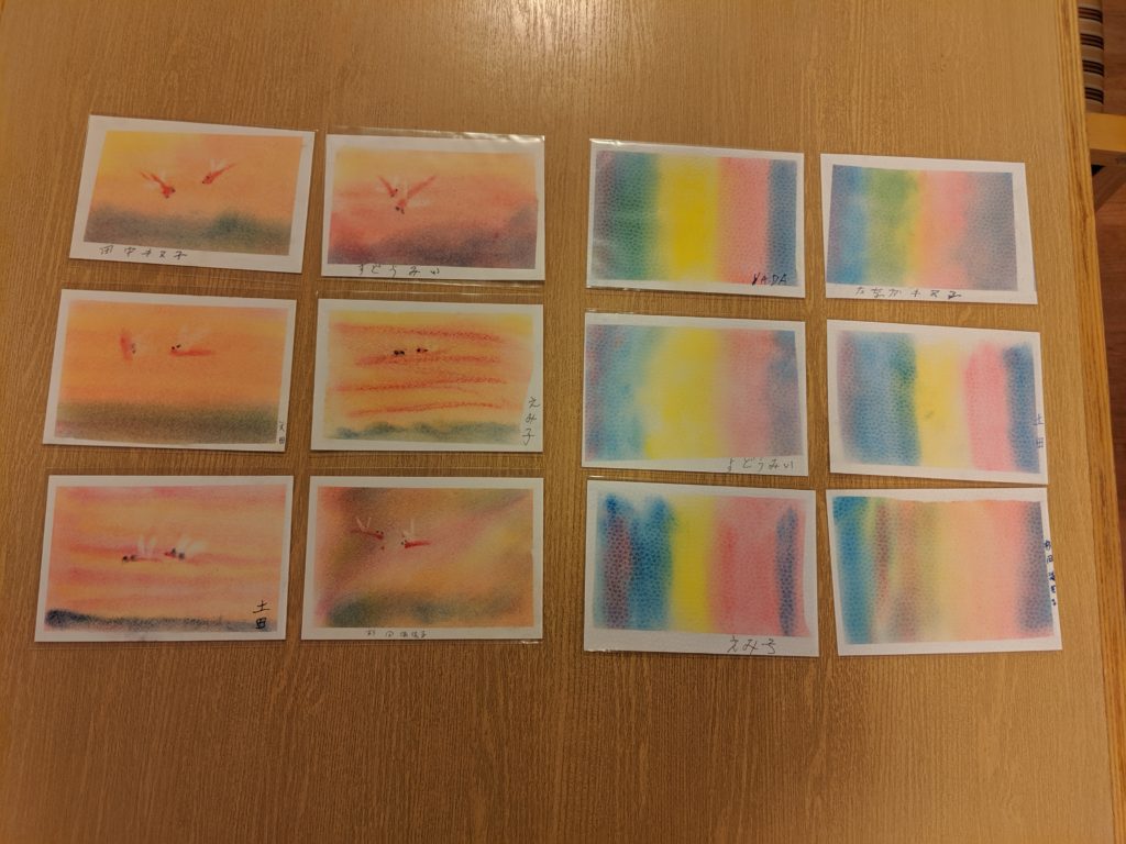 作品を眺める 20190921 「七色」「赤とんぼ」 グループホームにて 皆様、描いている時は「これでいいのかしら?」と不安なご様子でしたが、出来上がってみると何度も嬉しそうに作品を眺めていらっしゃいました♡