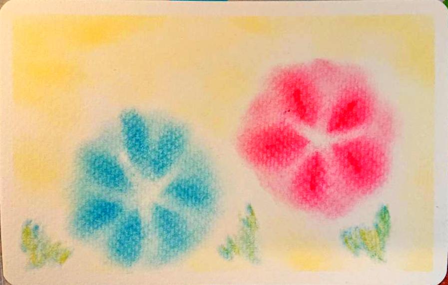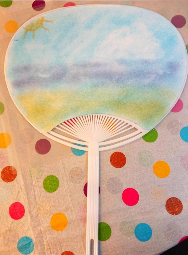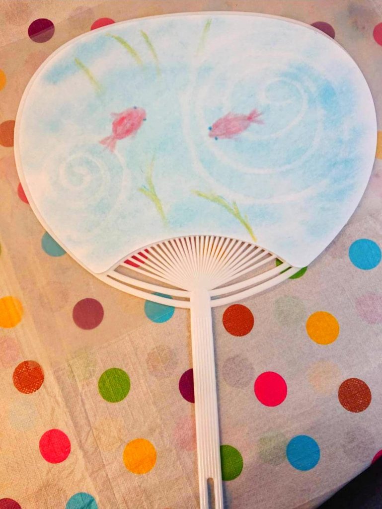 心躍らせ 20200624 「金魚」「海」「アサガオ」真澄屋にて ワークショップ再開のための事前練習。友人にお付き合いいただき、団扇を完成。もちろんポストカードに描いて飾るも良し、さらに身近に使用できるものであれば出来上がりの喜びはそれ以上。涼を楽しむアイテムにいかがでしょう?