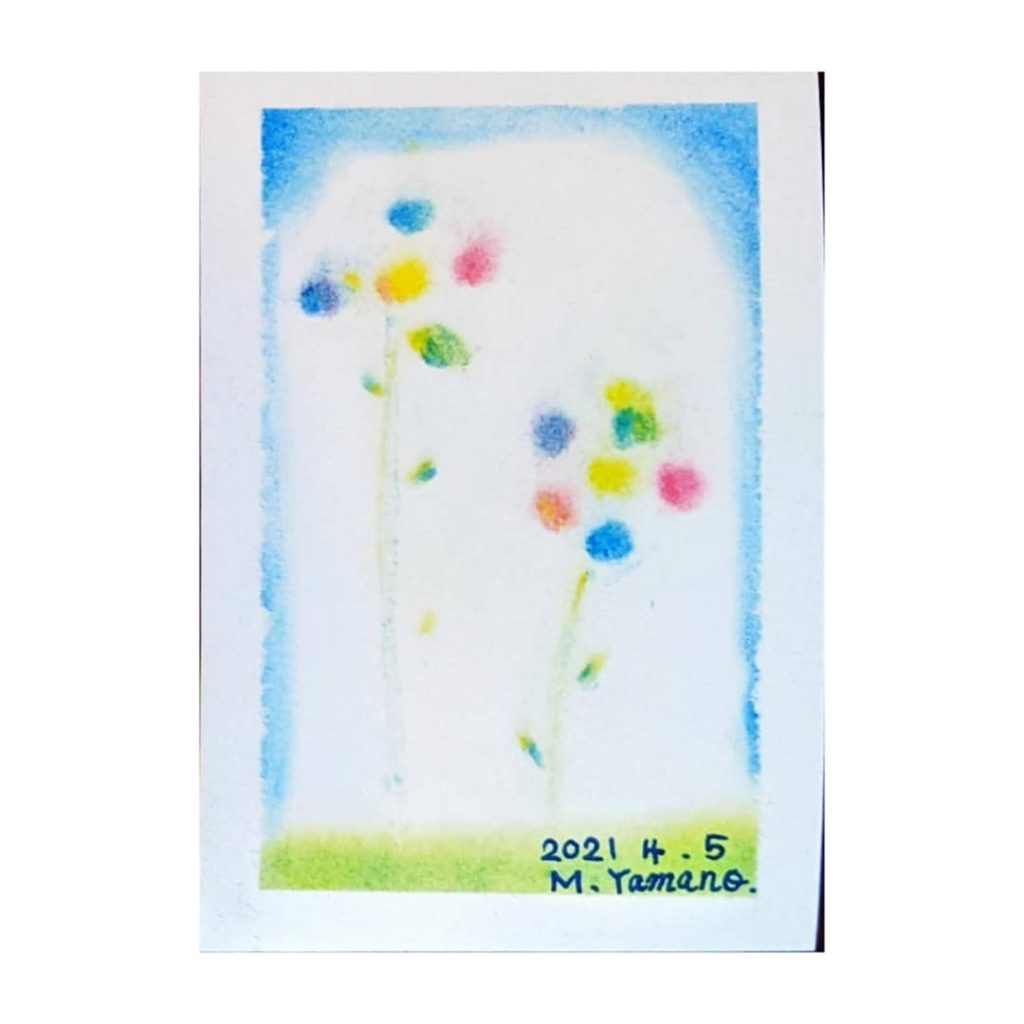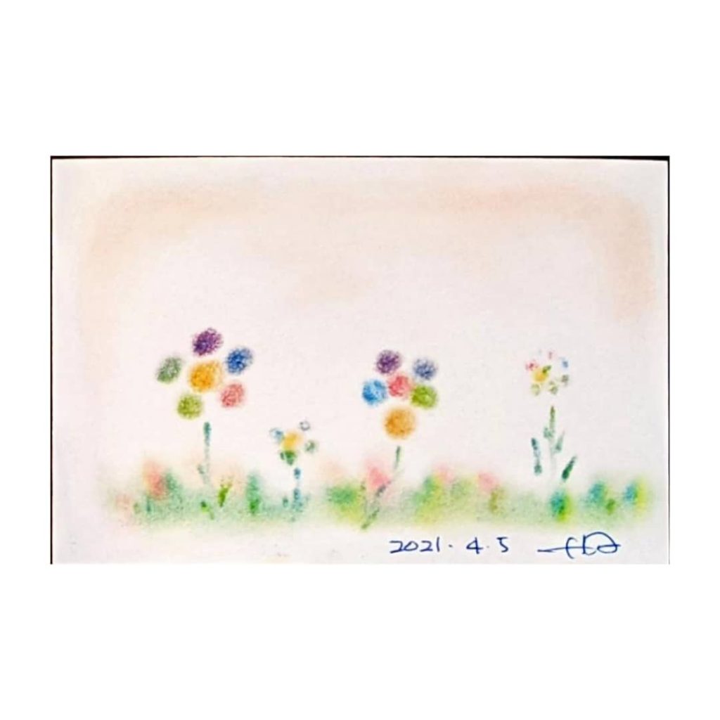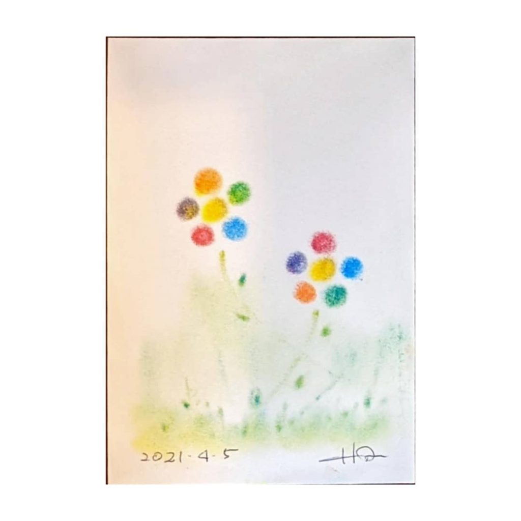 再開と再会が叶いました。季節はもう春。深く暗いところから抜け出し、漸く陽の光にあてられたパステルカラーの映える季節。参加者の方々も久しぶりの感覚とともに楽しみながら描かれていました。当たり前にできていたことができなくなった今、一期一会の大切さも一日の大切さも改めて知らされることになりました。全てのことに感謝を込めて。本日のお題は「ぐるぐる色のお花」「天道虫」でした。