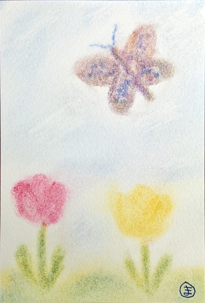 余裕のある方々には、指を使ったオリジナル作品を描いていただきました。すると可愛らしいチューリップとアダルトなくちびるの抽象画。とても対照的ですよね。
