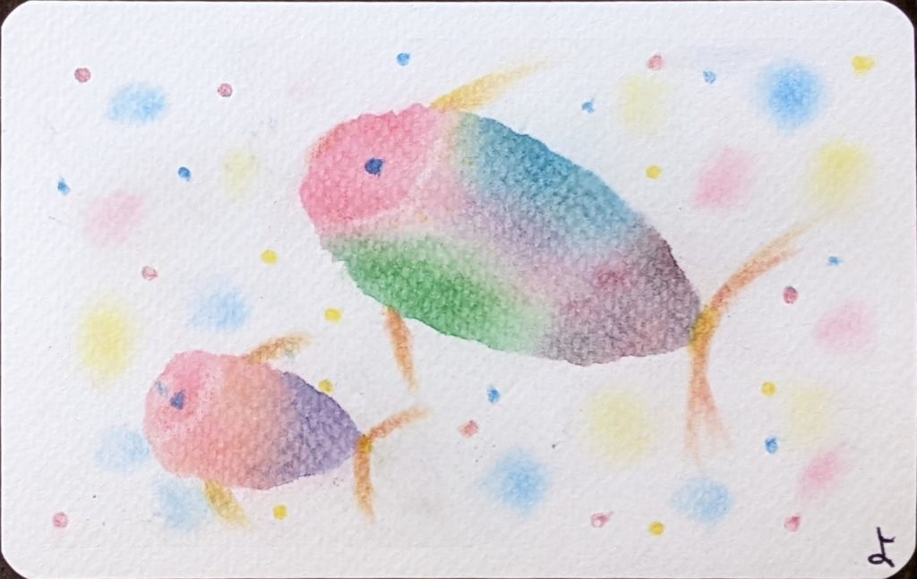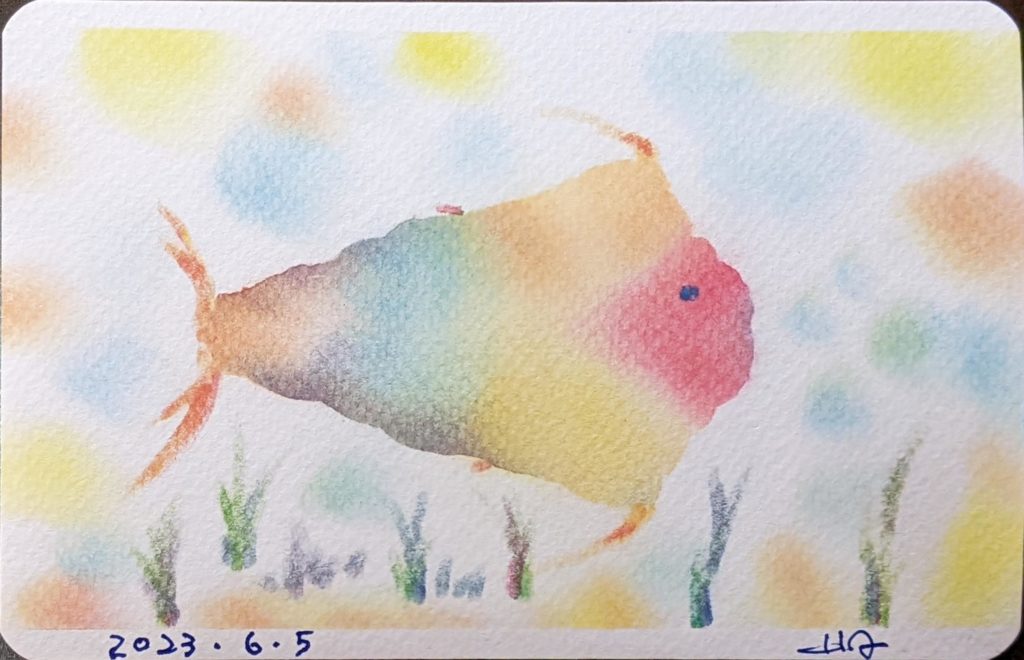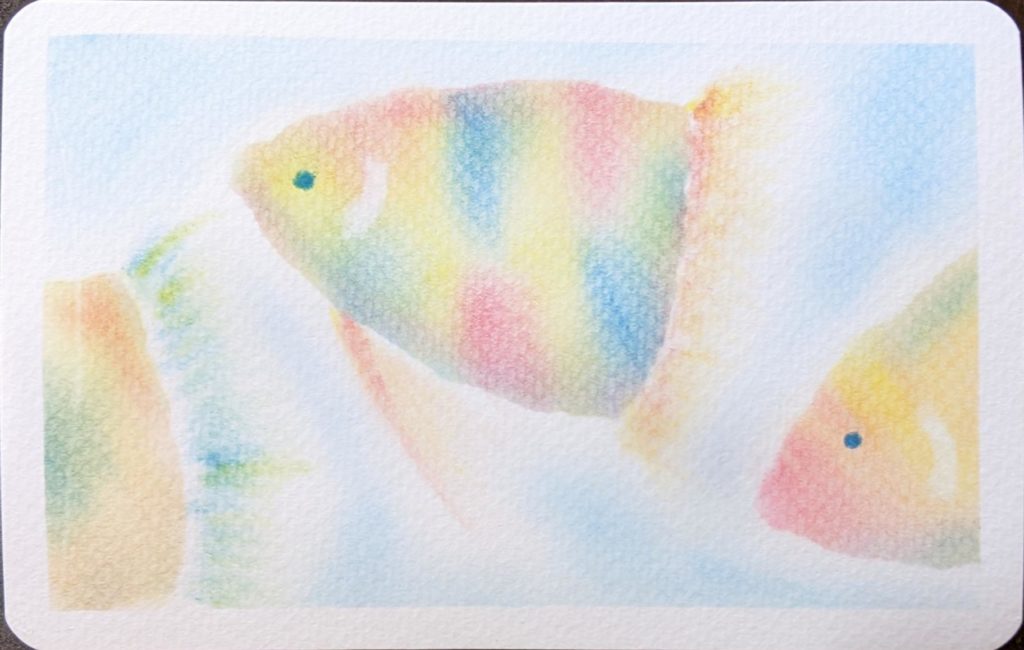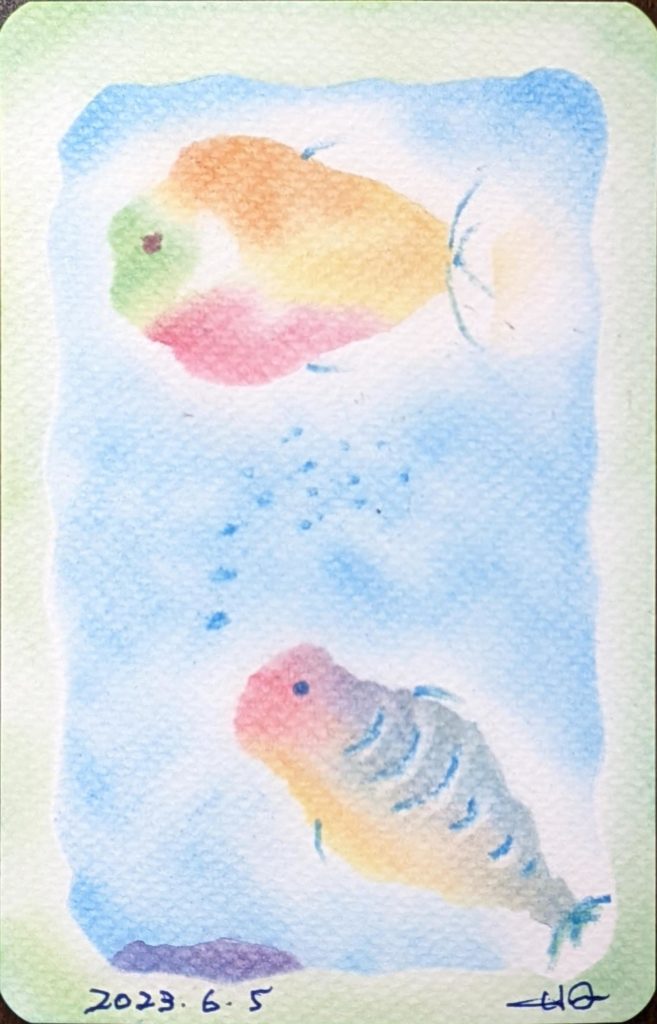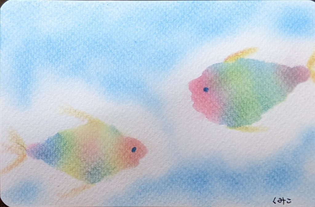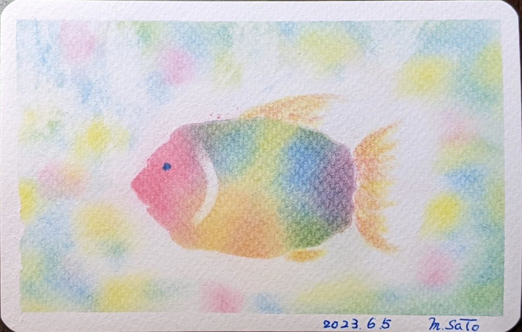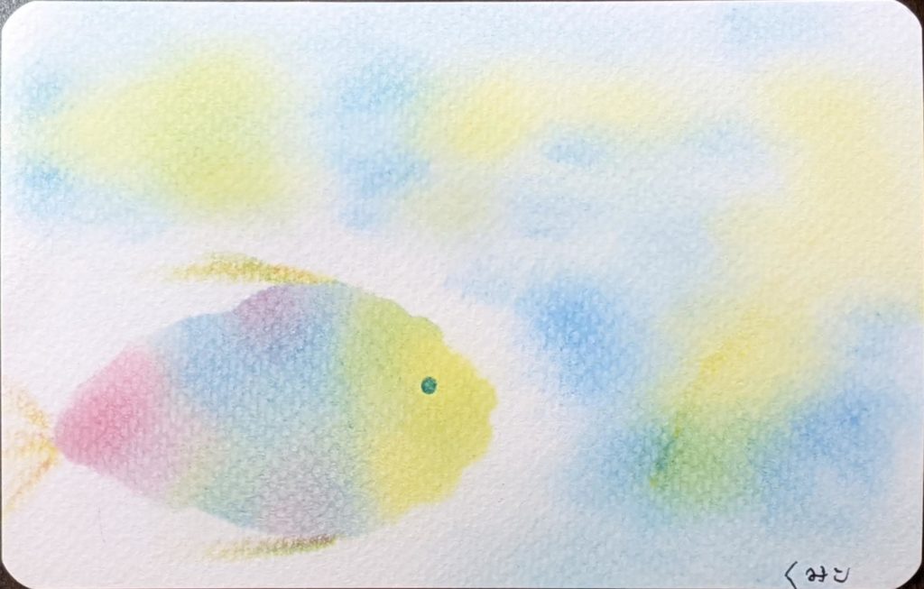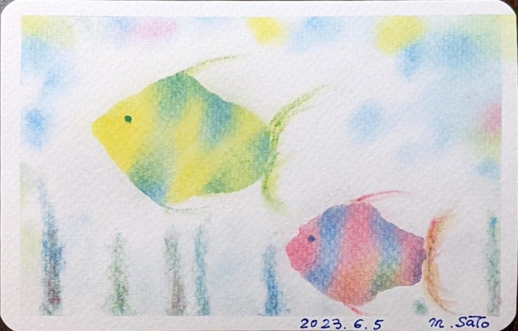 ユラユラSwimmin’ 「熱帯魚」と聞けばWink•••ん?年代が(笑) 皆さん、ユラユラと漂うよう めいめいの世界へ入り込んでいましたね♪ 深海魚?空想の魚?キャラクター?ペンギン?形も様々 鮮やかな色使いで楽しい熱帯魚が描けました♡