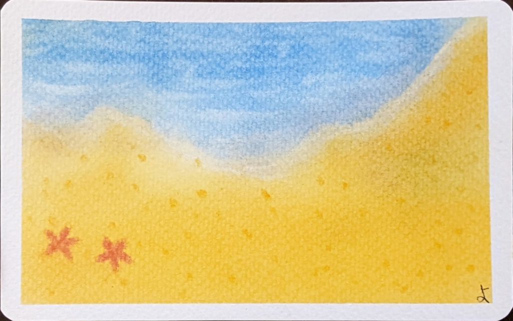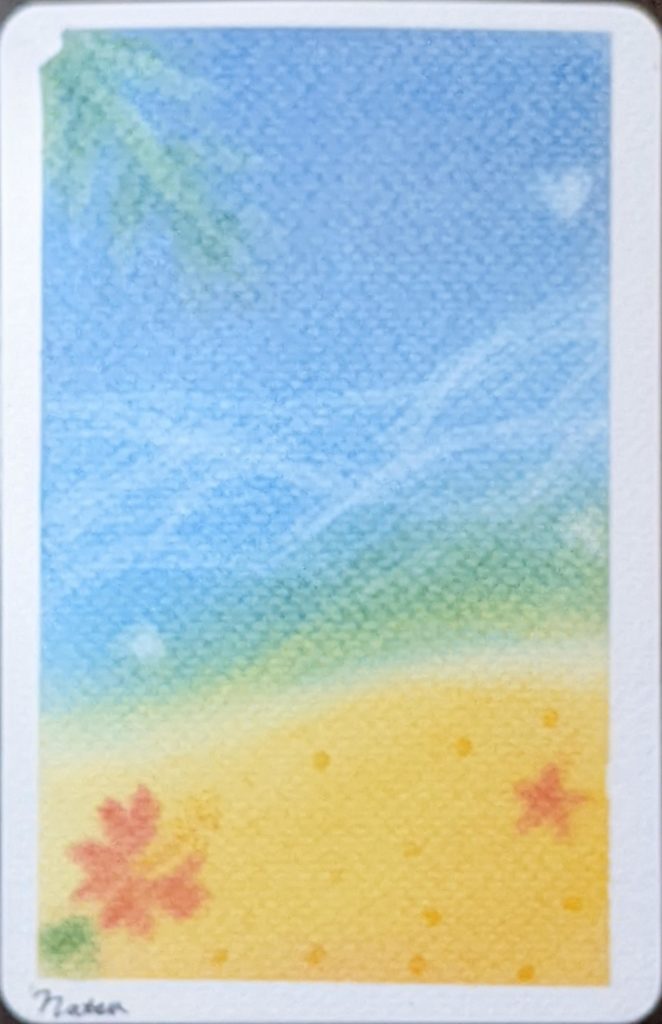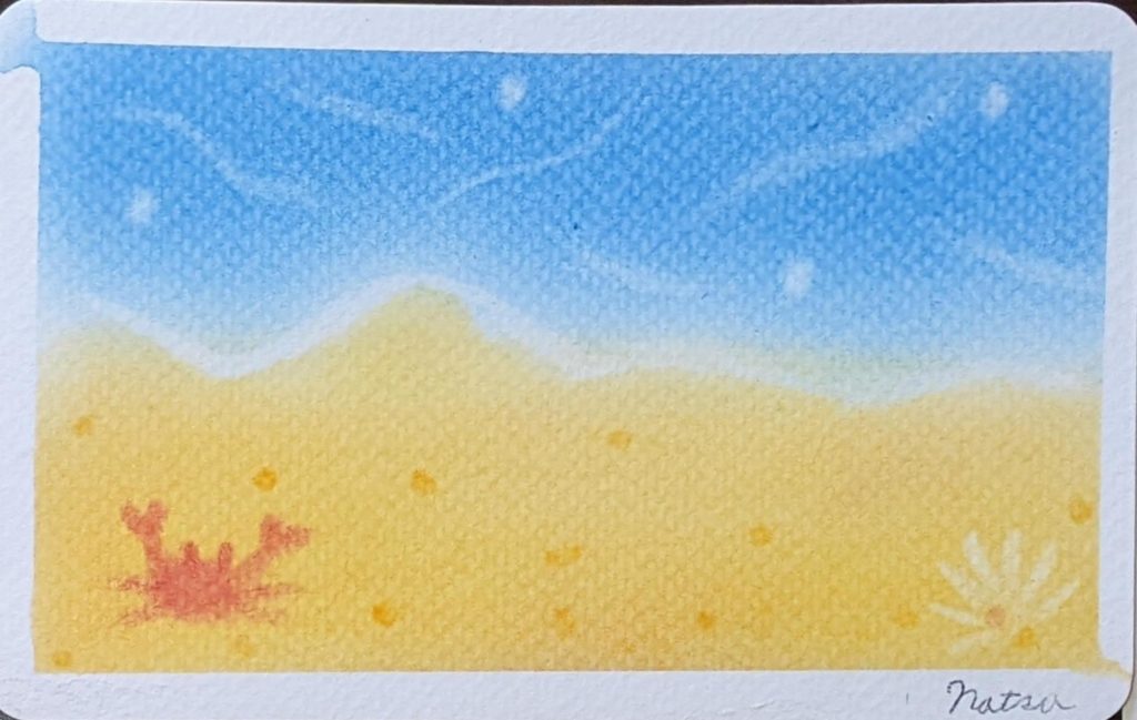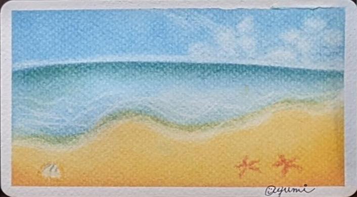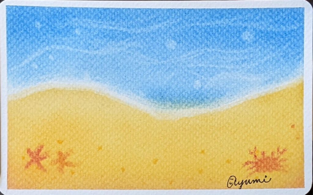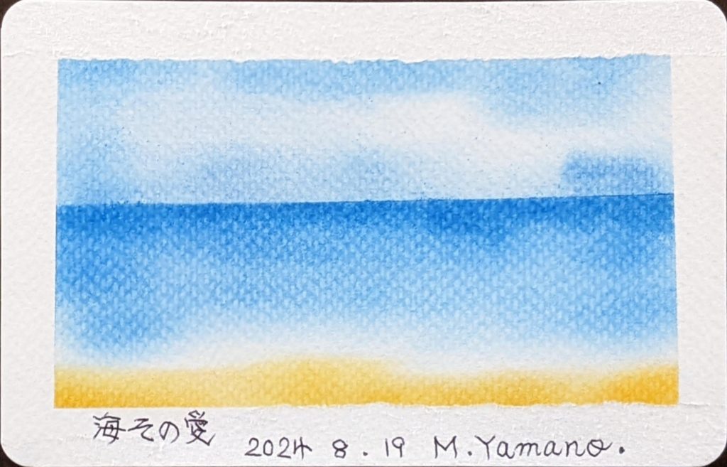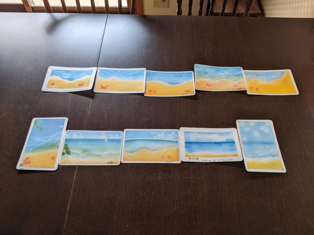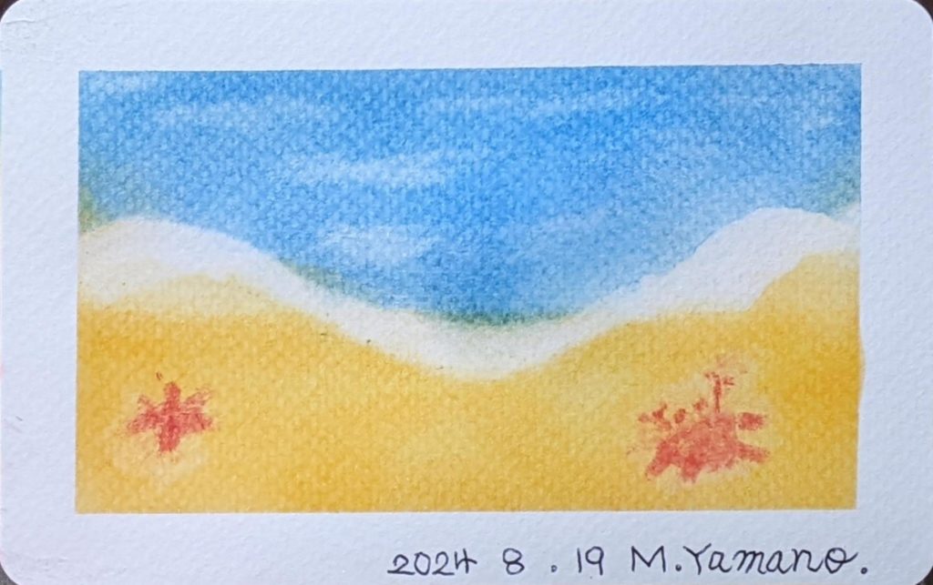 残暑ですが… まだまだ暑さが続いており、涼しさを求めてやまない日々ですよね。今日のお題は「波打ちぎわ」。色々な地域の浜辺を想像しながら楽しく描いていただきました。描き終えてから波を繋げて並べる作業も楽しんでいただけたようです。