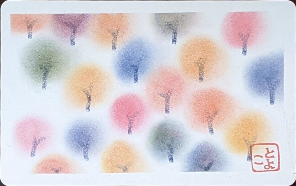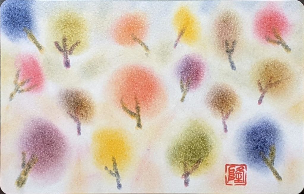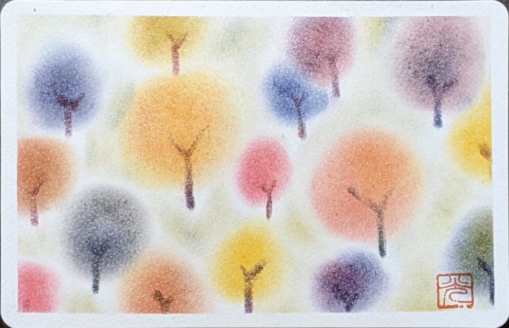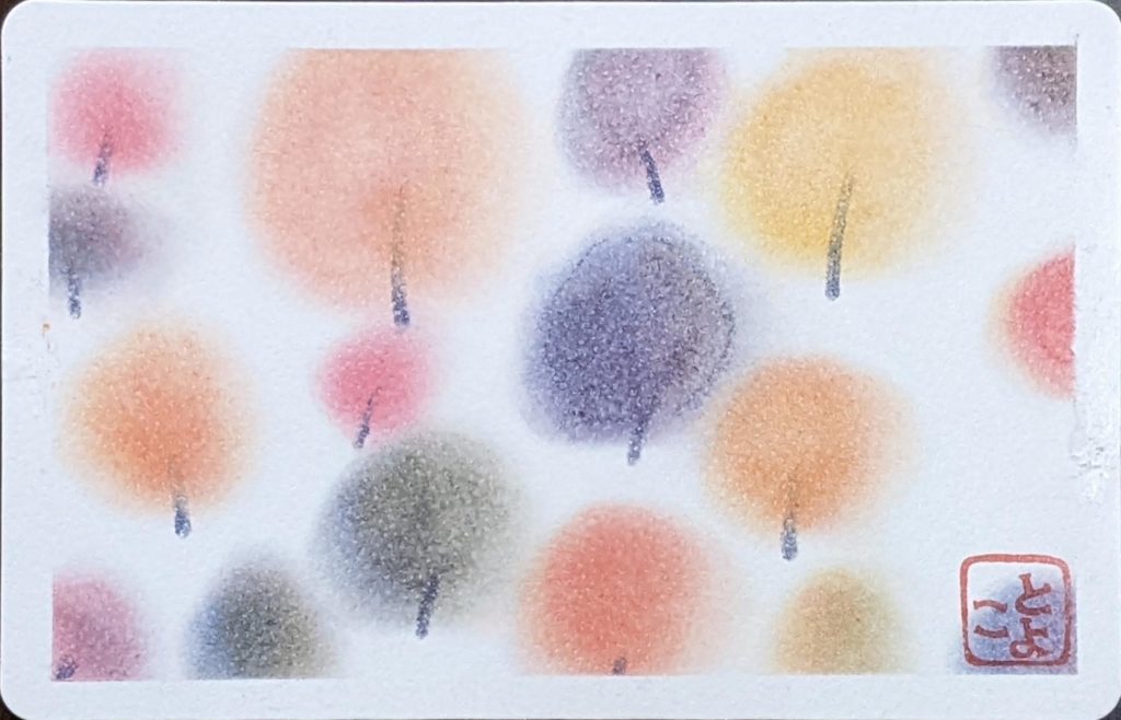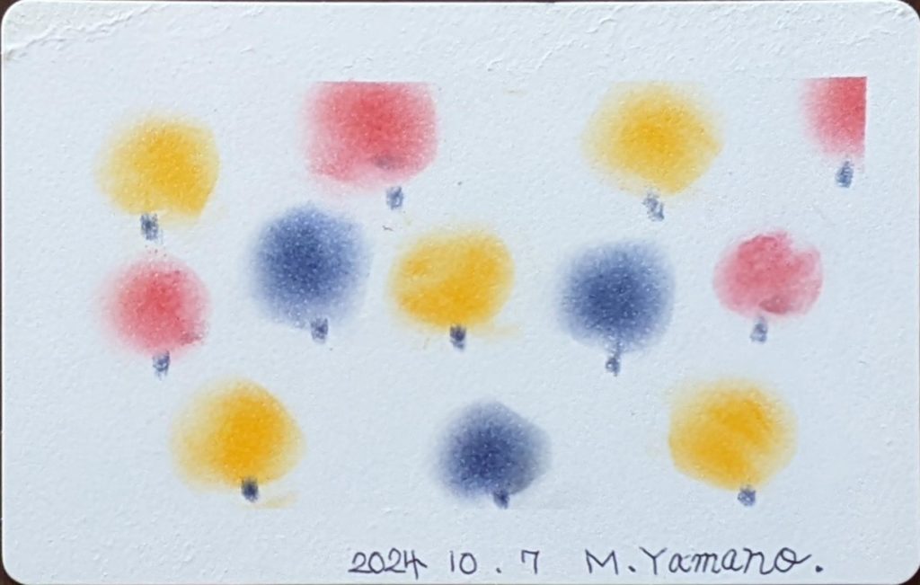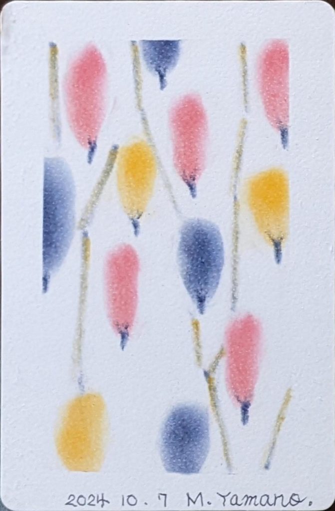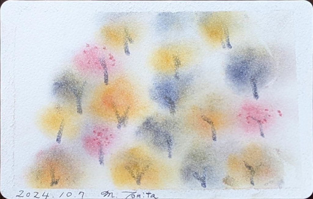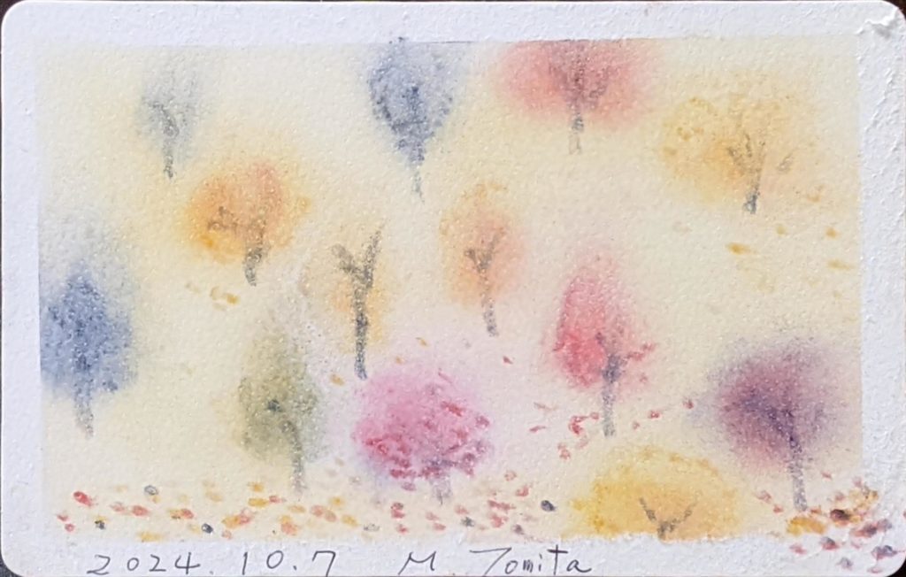 今回のお題は「ぐるぐる色の森」秋バージョン。秋は、茜色、竜胆(りんどう)色、柿色、尾花色、紫苑色、栗皮色、団栗色など、素敵な和名のある色たちが顔をだします。季節を感じながら生活をすることって案外贅沢な楽しみ方なのかも知れませんね。いつになく鑑賞時間が盛り上がり、素敵な空間で皆さんの素敵な笑顔をみることができ、とても嬉しい秋の始まりです。