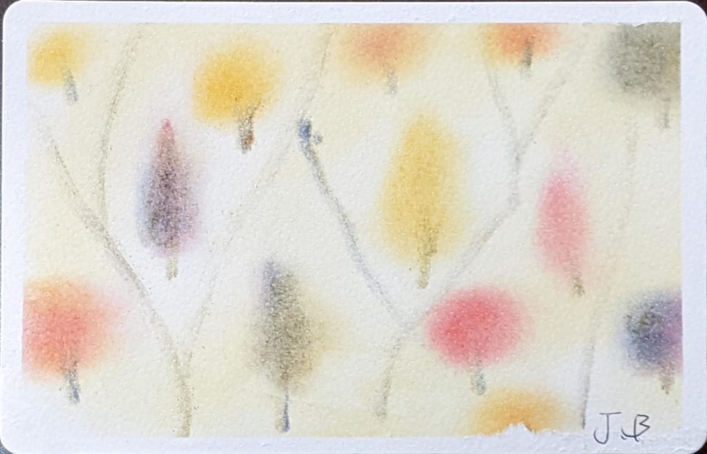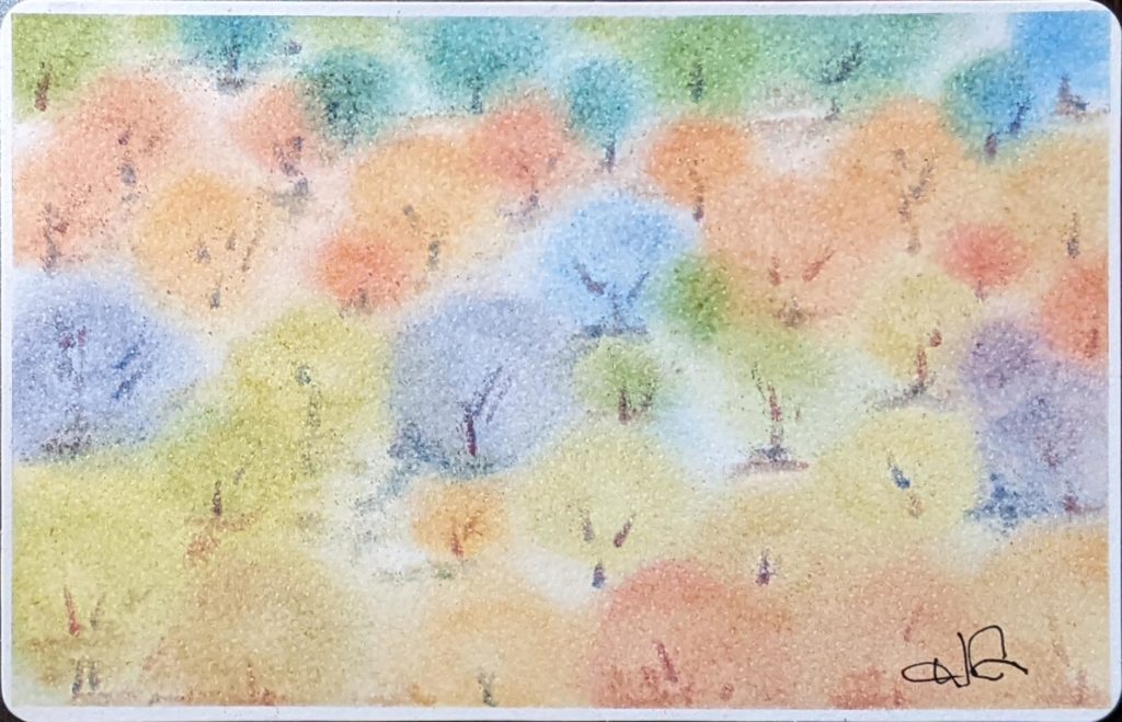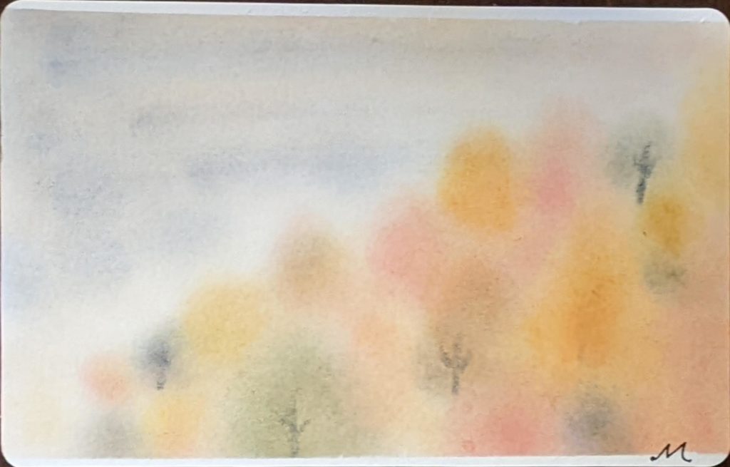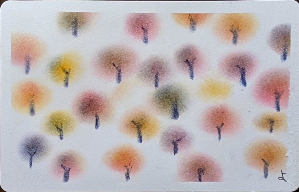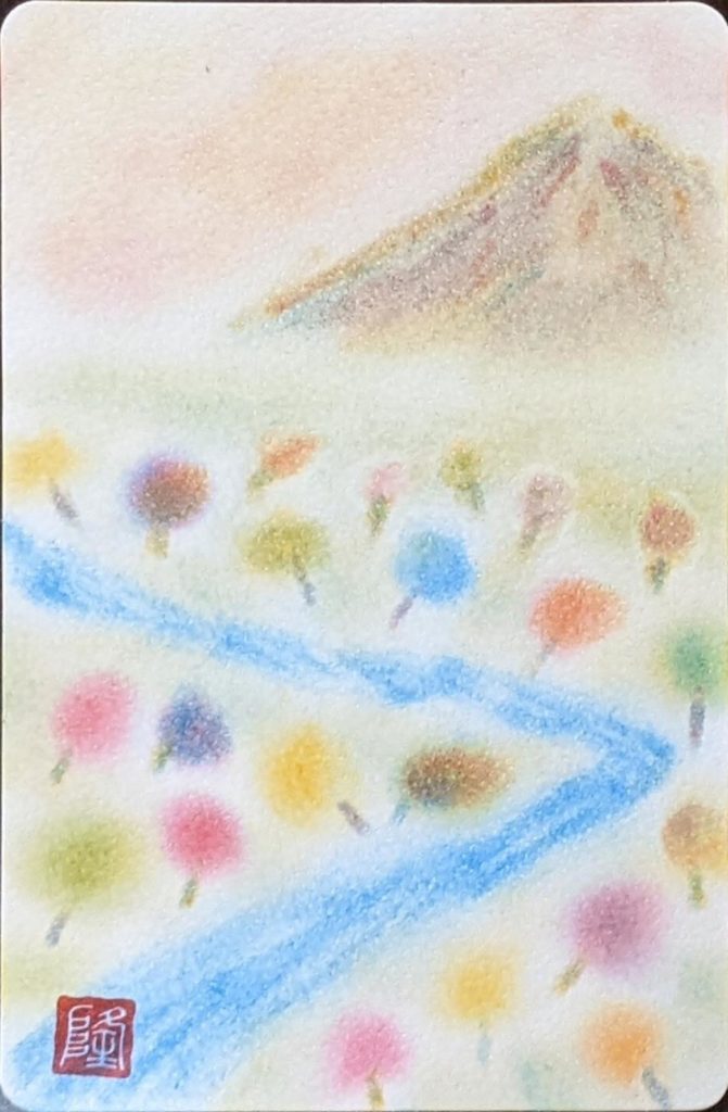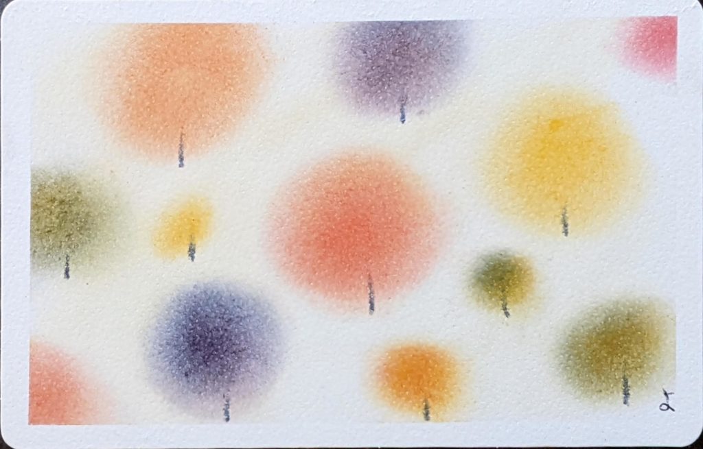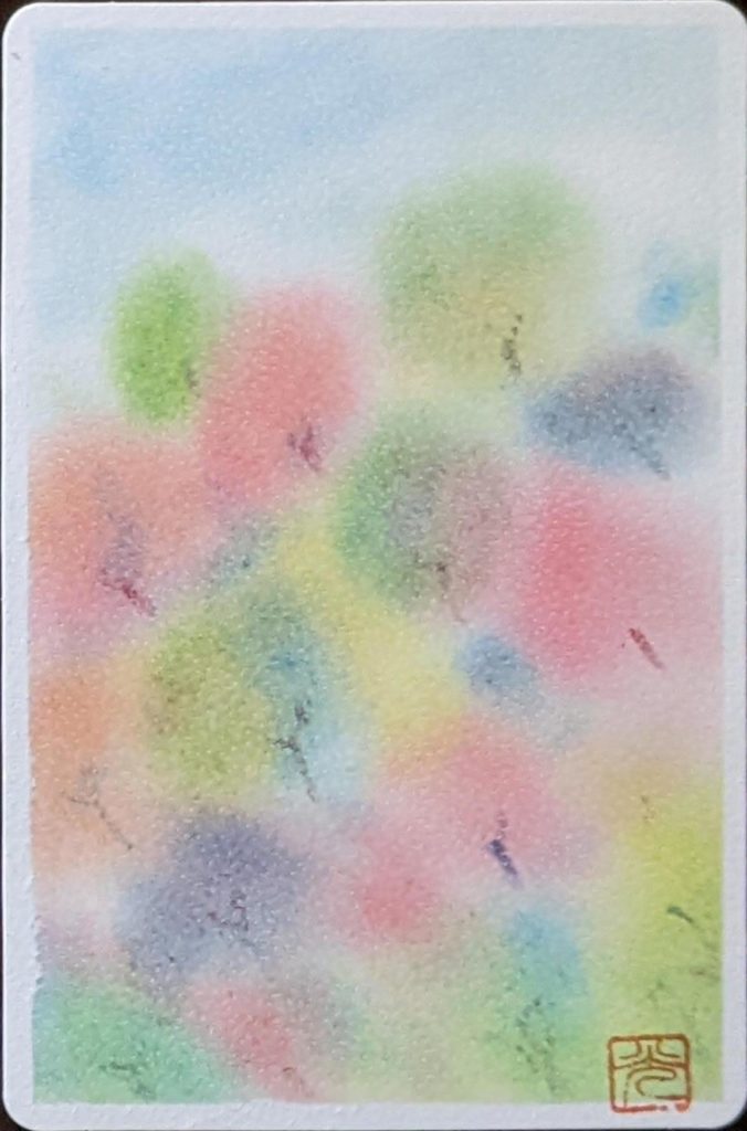 今回のお題は「ぐるぐる色の森」秋バージョン。秋は、茜色、竜胆(りんどう)色、柿色、尾花色、紫苑色、栗皮色、団栗色など、素敵な和名のある色たちが顔をだします。季節を感じながら生活をすることって案外贅沢な楽しみ方なのかも知れませんね。いつになく鑑賞時間が盛り上がり、素敵な空間で皆さんの素敵な笑顔をみることができ、とても嬉しい秋の始まりです。