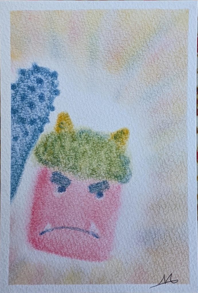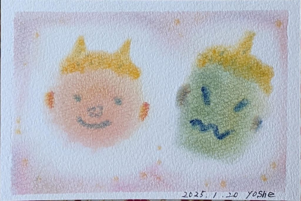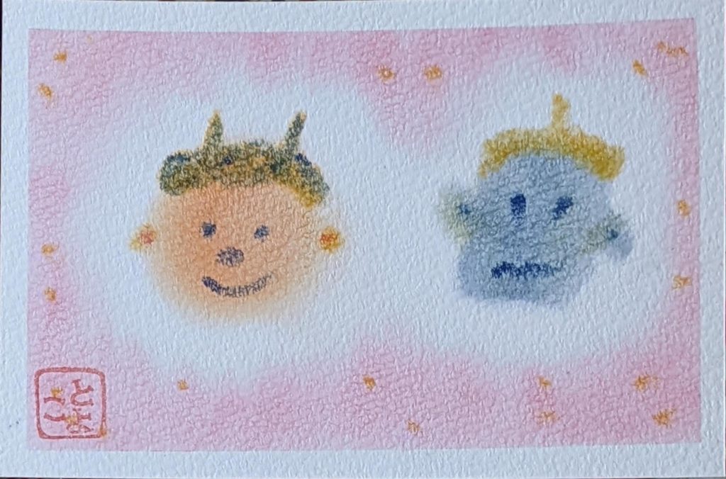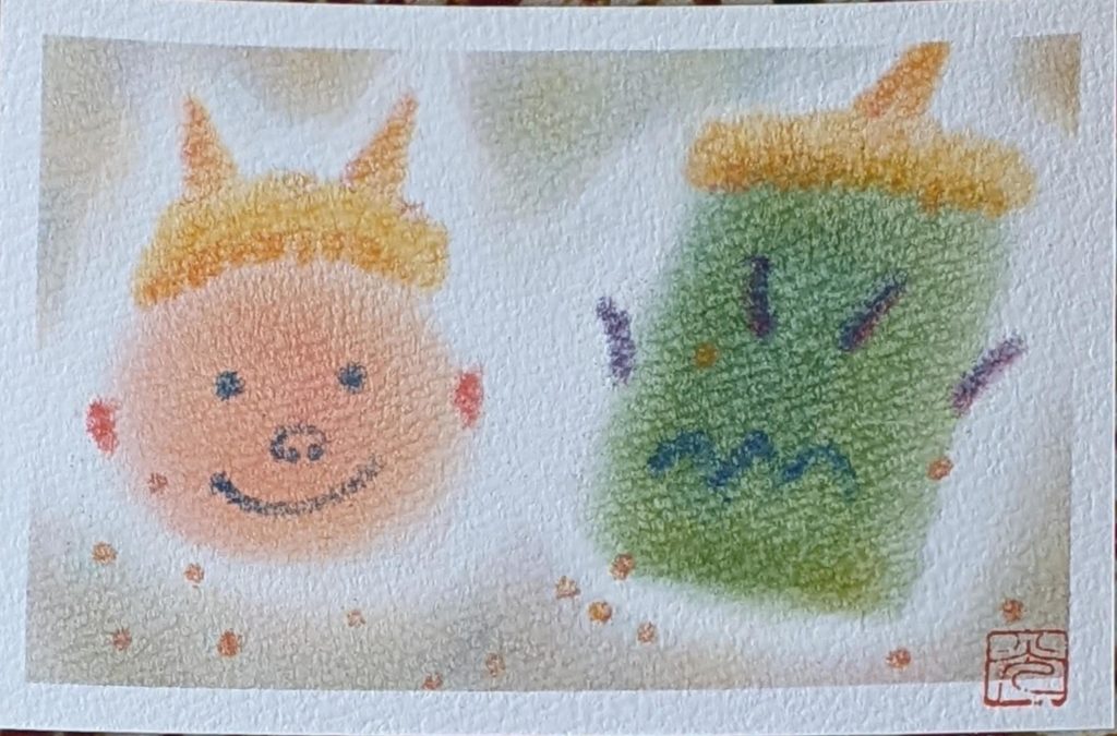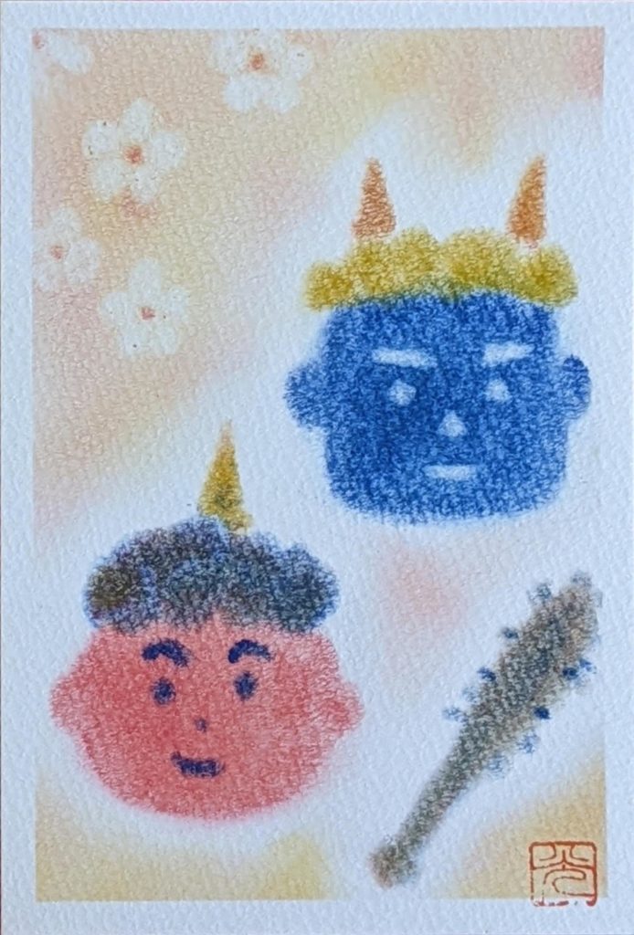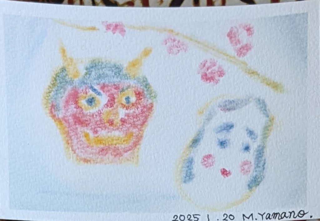 本日のお題は「鬼」です。節分の鬼は、災害や病などの「邪気」として、もうひとつは「煩悩」として扱われ、この2つを追い払うという意味で豆をまくそうです。前者の意味でしか知りませんでした💦鬼の色にも意味があるそうで・・・。いくつになっても知らないことはあるものですね。年明け初のmattari会、皆さんいつになく集中力が高まっていたように感じられました。2枚目は素敵な発想で楽しい作品が出来上がりました✨