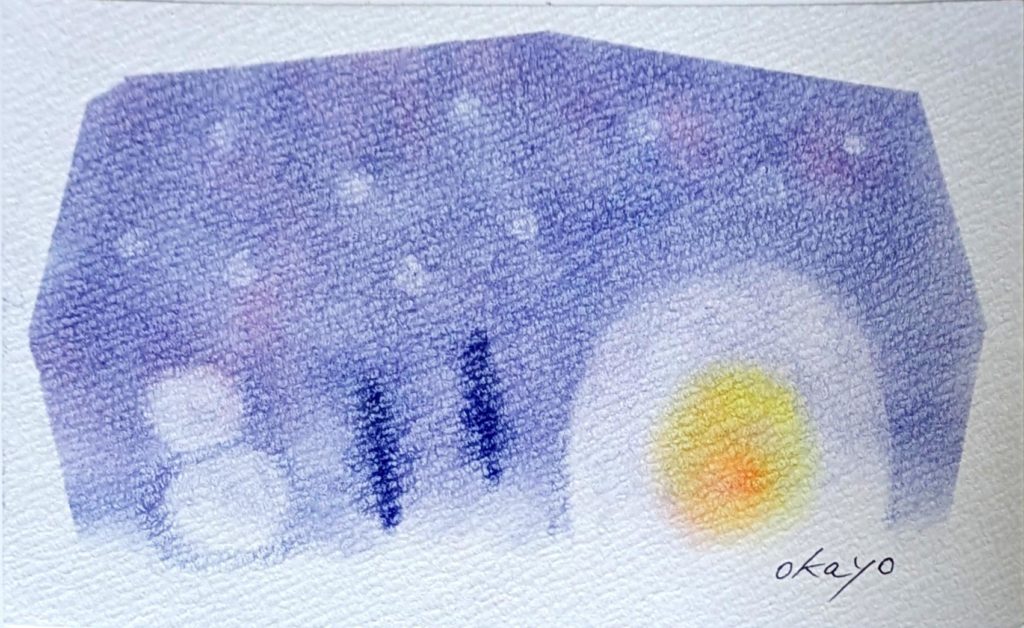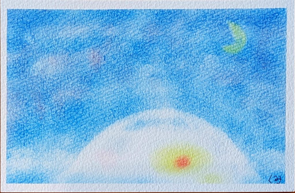 かまくら 本日のお題は「かまくら」。レシピをみるなり「雪見大福?水餅?かもめの玉子?」と美味しそうな名前が列挙されていましたね(笑) 確かにかまくらだけだと色々な美味しそうな食べ物にみえてきました。ということで2枚目は雪だるまを描き足しました。